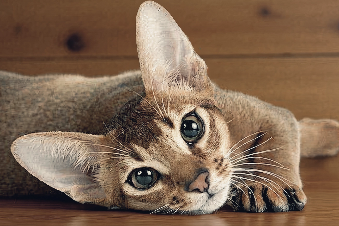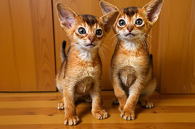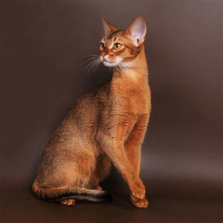 Особенностью абиссинской породы является ее внешний вид: сильное и гибкое телосложение, позволяющее совершать впечатляющие прыжки, гармоничное тело с длинными ногами и тонким хвостом. Голова имеет клиновидную форму с выраженным подбородком, а глаза – крупные, миндалевидные, с возможностью различных оттенков, кроме ориентального или абсолютно круглого разреза. Уши большие, слегка наклонены вперед, создавая настороженный вид. Шерсть короткая, густая и упругая с характерным переливом тиккинга, обеспечивающая блеск и мягкость. Окрас – теплый и насыщенный, без рисунка благодаря уникальному явлению тиккинга, когда каждая шерстинка имеет полоски светлых и темных оттенков.